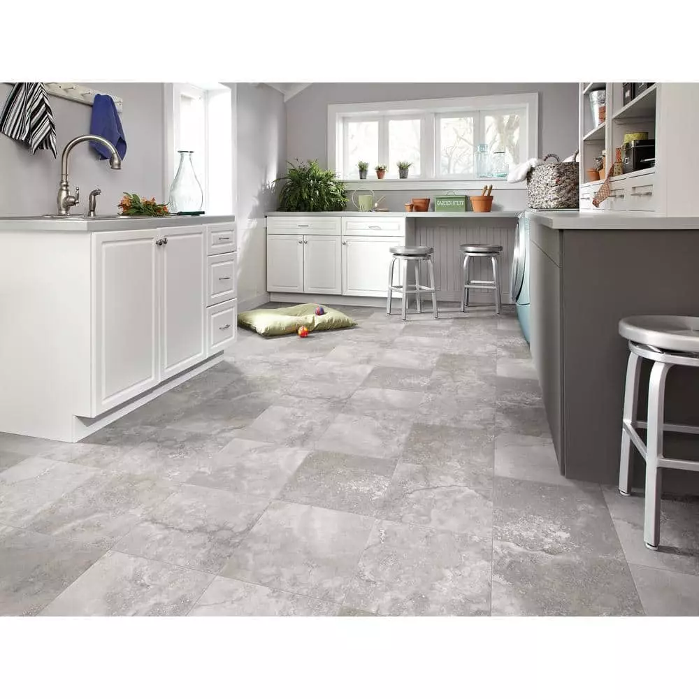 Featuring a cool, grey travertine pattern, this residential vinyl sheet from TrafficMASTER brings a stylish look to your space. Easy to install and clean, it offers exceptional comfort with its thick, cushioned backing that works to reduce sound throughout rooms. A urethane wear layer provides the toughest protection against common household accidents, ensuring long-lasting appearance and functionality.